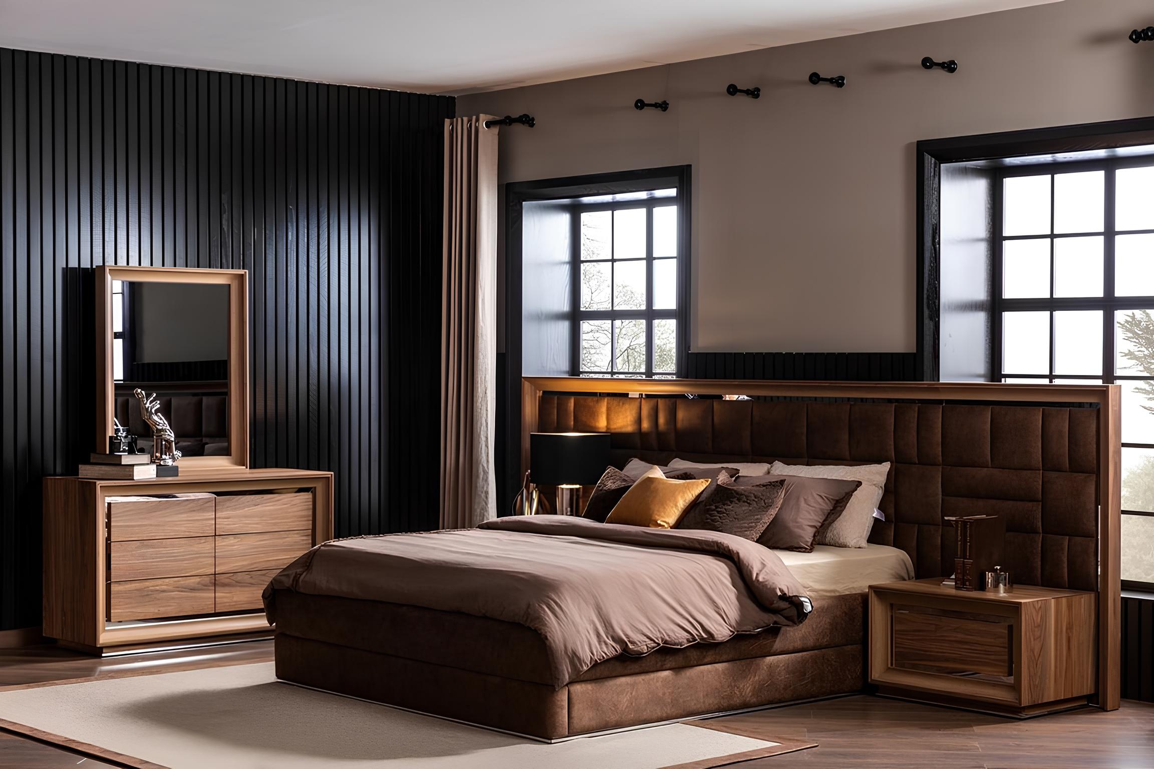 Elevate your sanctuary with our exquisite complete bedroom set, featuring a sumptuous bed paired with meticulously crafted luxury nightstands, all in a rich brown finish. This ensemble is a testament to two decades of fine craftsmanship, embodying sophistication and elegance. Each piece is designed to create an exclusive ambiance, seamlessly integrating functionality with luxurious aesthetics. The harmonious lines and premium materials invite a sense of tranquility, making it the ideal choice for discerning individuals who appreciate the finer things in life. Transform your bedroom into a haven of style and comfort, where every detail speaks to an elevated lifestyle. Experience the allure of refined living with this distinguished set.