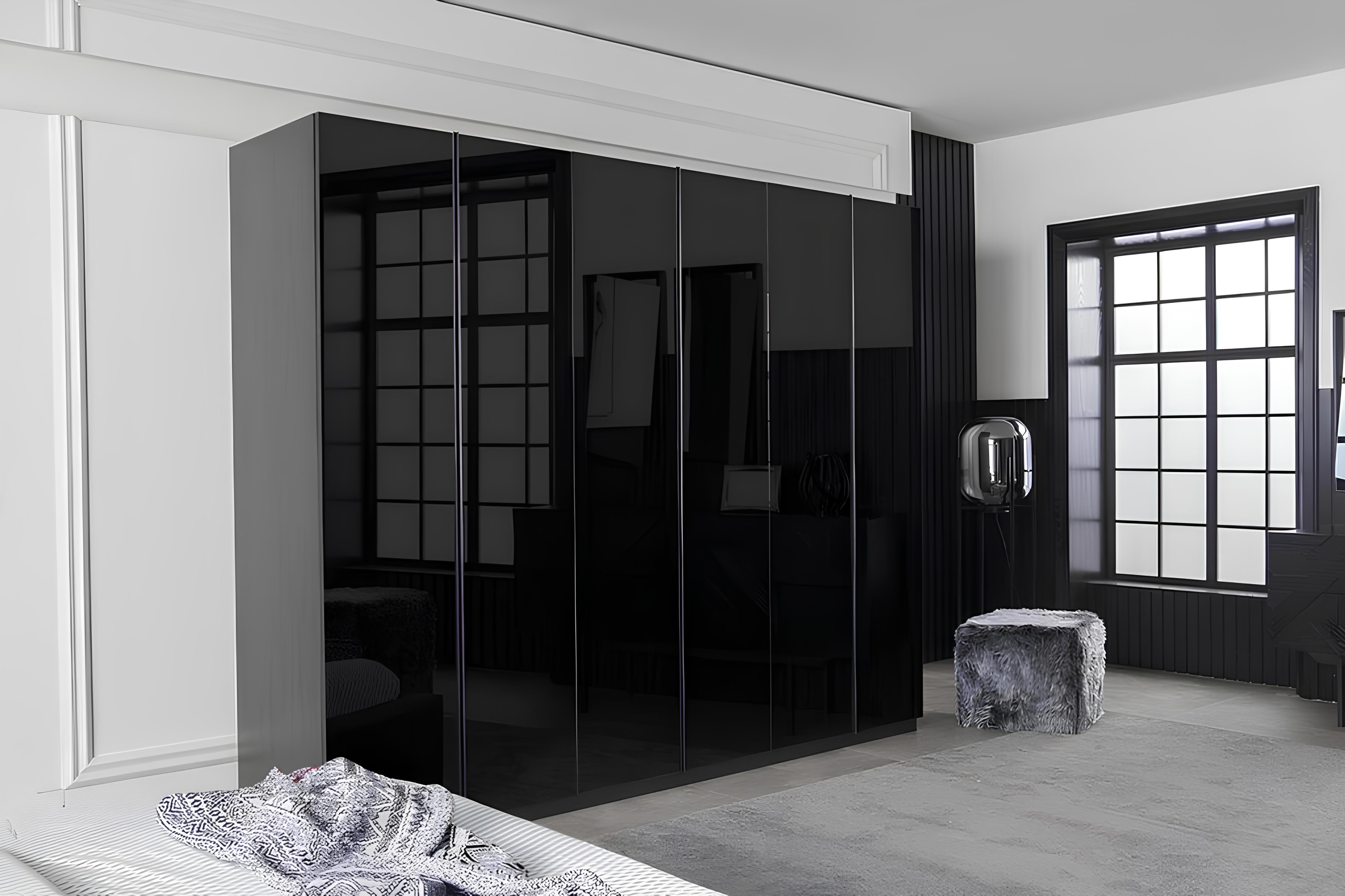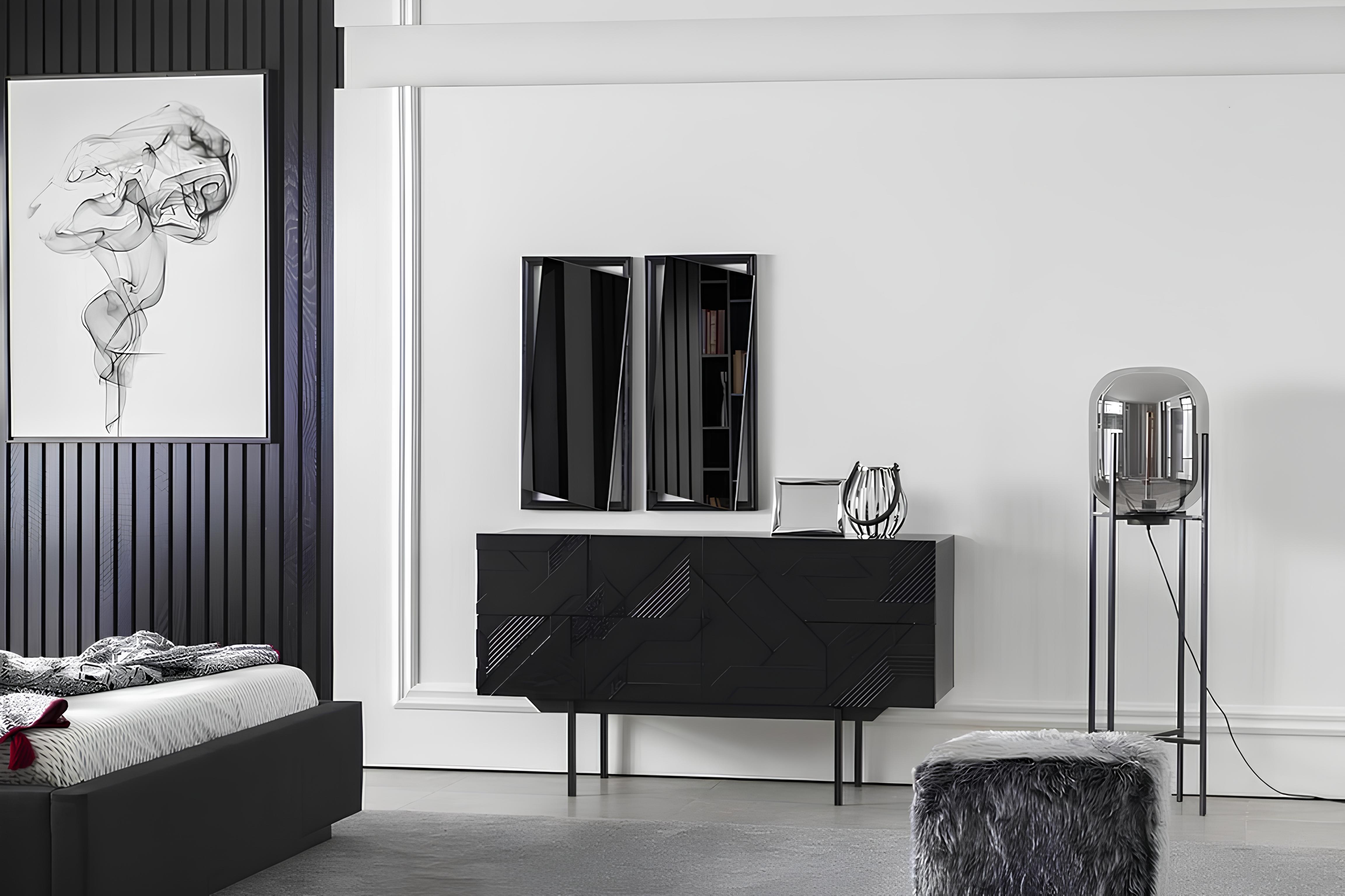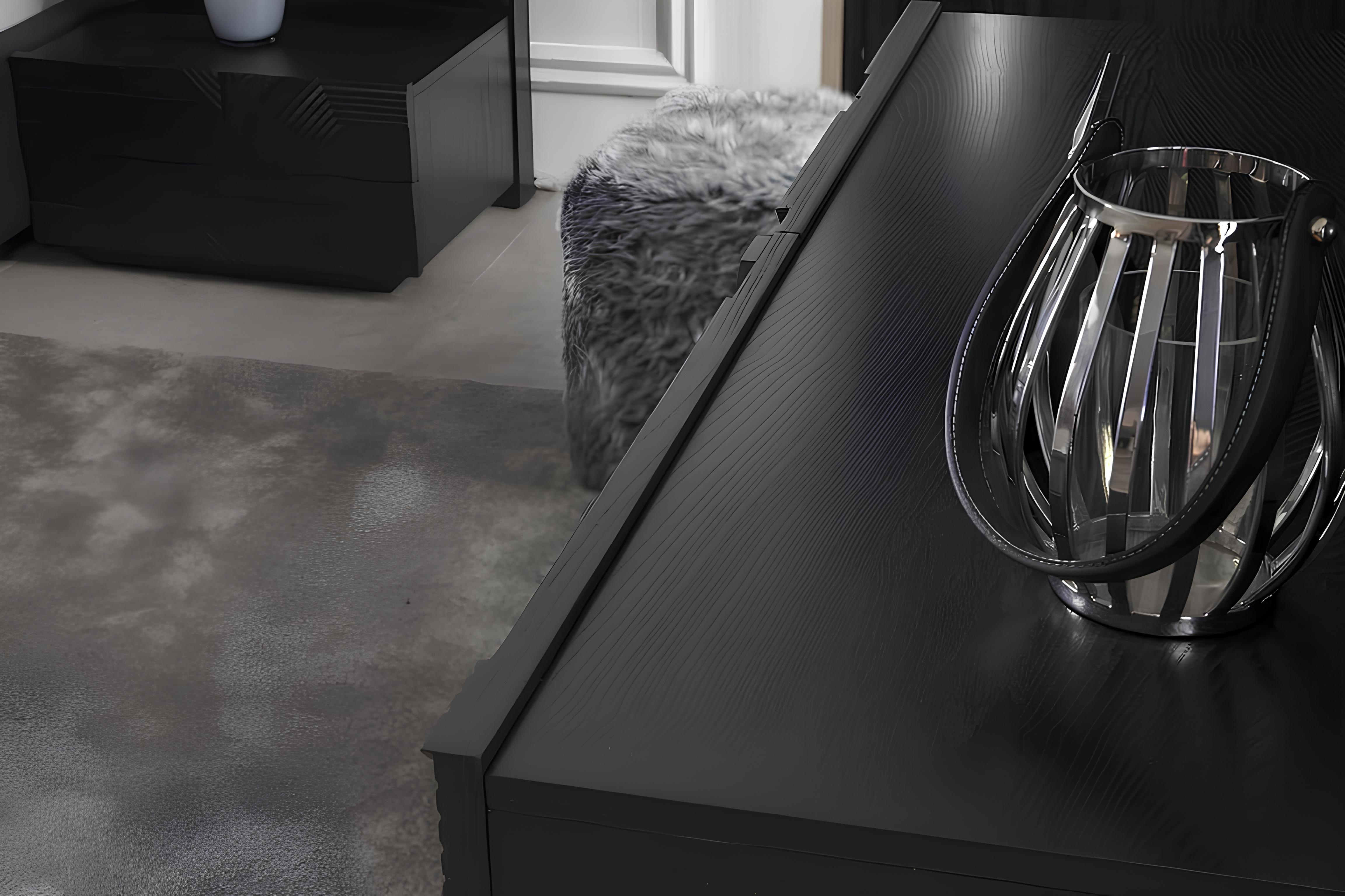 Elevate your sanctuary with our Luxury Bedroom Set, an exquisite ensemble comprising a wardrobe, two nightstands, and two additional nightstands, meticulously crafted to embody sophistication. Each piece is enveloped in sumptuous black polyester, exuding an air of refined elegance that seamlessly integrates with any decor. The wardrobe offers generous storage while maintaining a sleek profile, and the nightstands provide the perfect perch for your essentials, showcasing a harmonious balance of functionality and style. With over 20 years of heritage in luxury furniture, this collection is designed for those who appreciate the finer things in life, offering a transformative ambiance that reflects an exclusive lifestyle. Indulge in the art of living well.