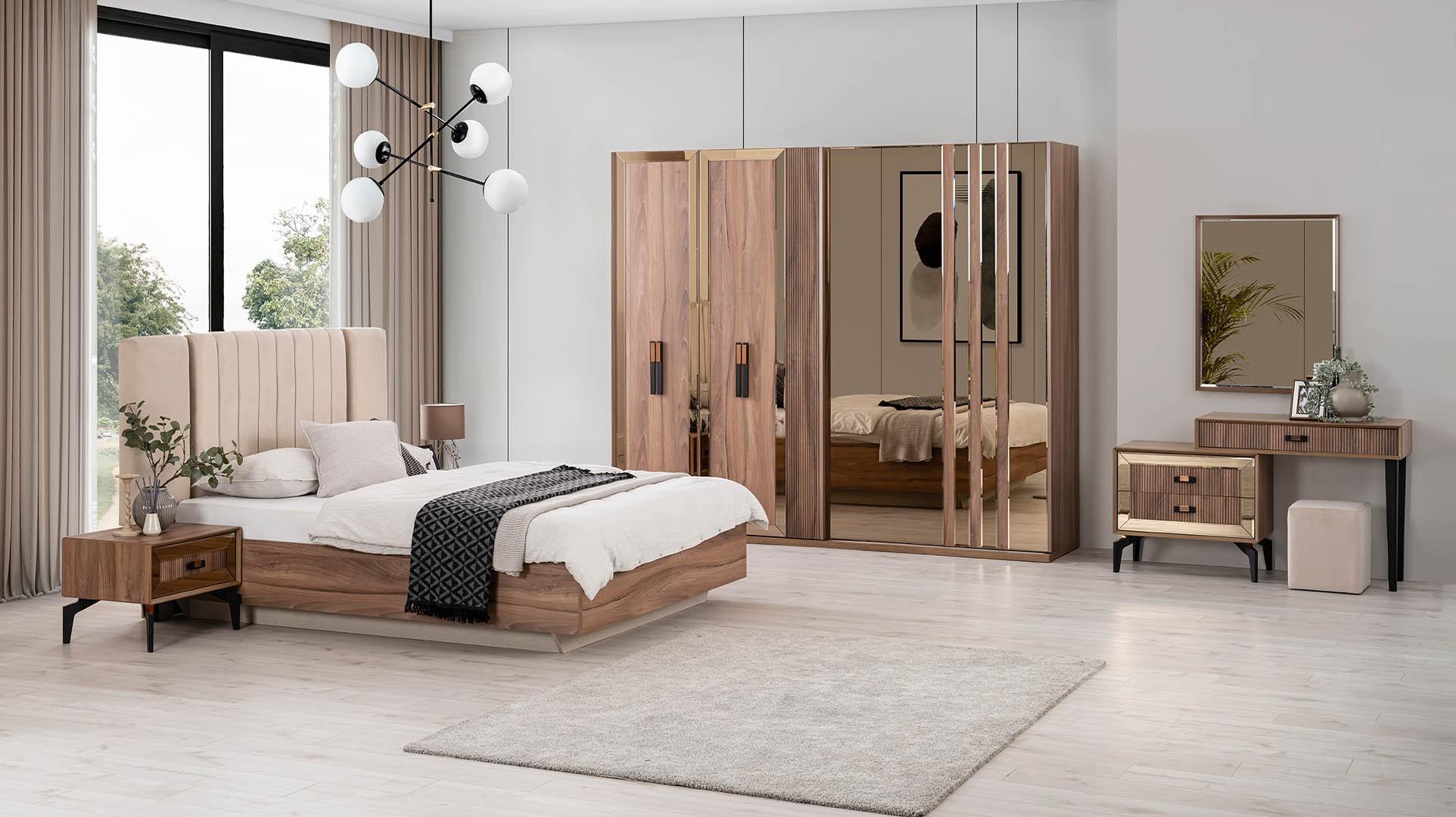 Luxury Double Bed Bedroom Suite Bed Wood Set 7-piece Brown Modern