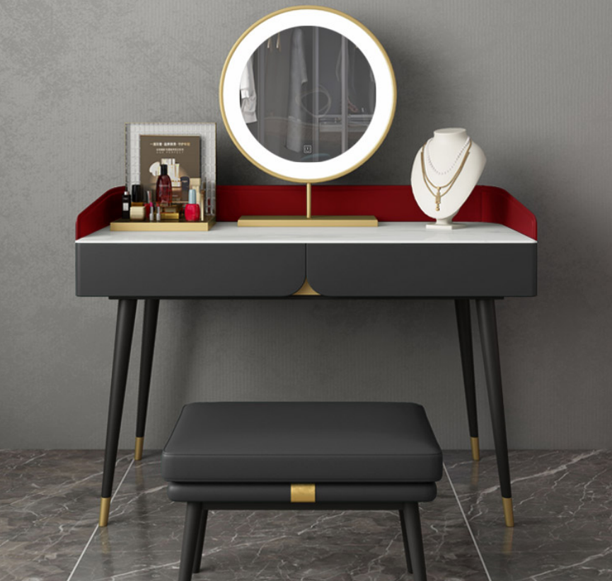 Perfect for aspiring hairdressers, makeup enthusiasts, or anyone who cherishes a well-organized personal space, this vanity table doubles as a dressing table and storage console. The spacious tabletop invites creative beauty setups, while the stylish stone detail adds a touch of luxury. Set it against a wall in your bedroom to maximize space efficiency while creating a dedicated area for grooming and relaxation. Whether you're preparing for a night out or simply indulging in a self-care routine, this Vanity Table serves as a reliable and attractive focal point in your daily life, making every moment in front of the mirror feel special.