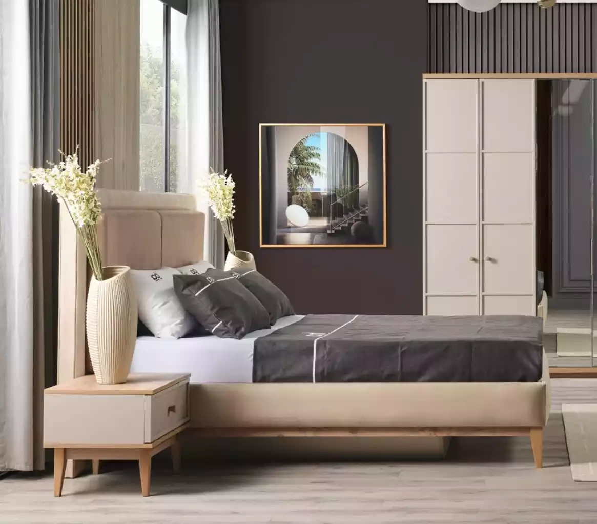 Indulge in the epitome of refined elegance with our Luxury Bed, accompanied by two modern wooden nightstands, all enveloped in a sumptuous beige textile. This exquisite ensemble transcends mere functionality, creating a sanctuary of comfort and sophistication in your bedroom. The bed's opulent design, characterized by its sleek lines and plush upholstery, invites restful nights and serene mornings. Complemented by the nightstands, crafted from premium wood, this collection enhances the aesthetic of any exclusive interior. With over 20 years of expertise in luxury furniture, our brand offers a selection that resonates with discerning tastes, making this piece not just a choice, but a statement of an elevated lifestyle.