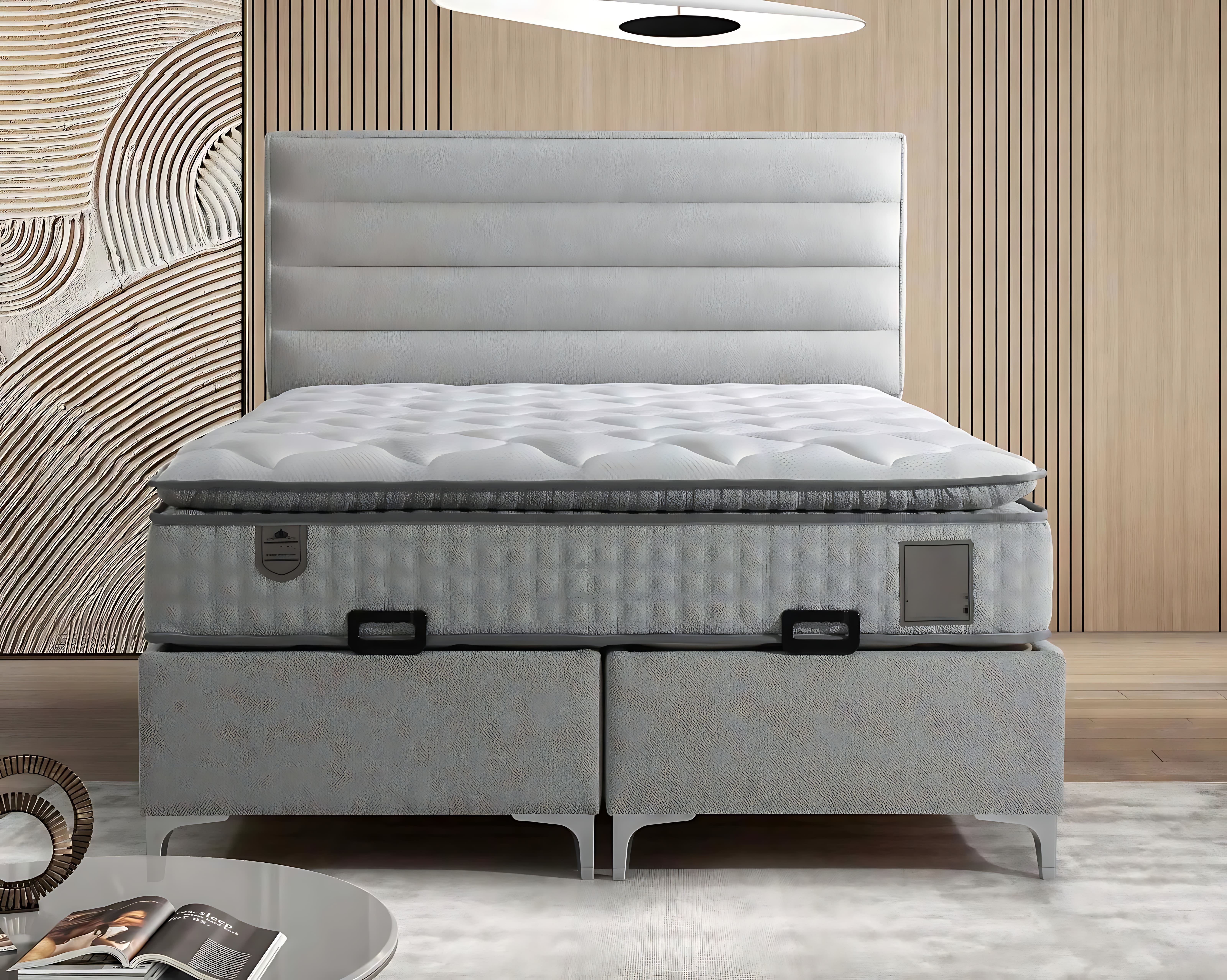 Experience unparalleled elegance with our luxurious bed, meticulously crafted from modern gray textile and complemented by an exquisite mattress. The rich gray wood frame exudes sophistication, seamlessly blending contemporary design with timeless charm. This masterful piece is not merely a bed; it is a statement of refined taste, embodying the essence of an exclusive lifestyle. The plush mattress promises restful nights and rejuvenating sleep, while the textured fabric invites you to indulge in its sumptuous embrace. Elevate your sanctuary with this exceptional creation, where every detail is a testament to two decades of luxury furniture craftsmanship, ensuring your home reflects the ultimate in elegance and style.