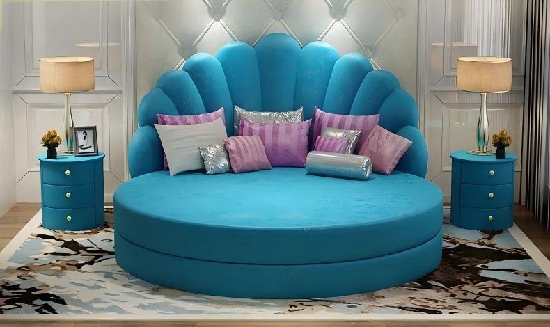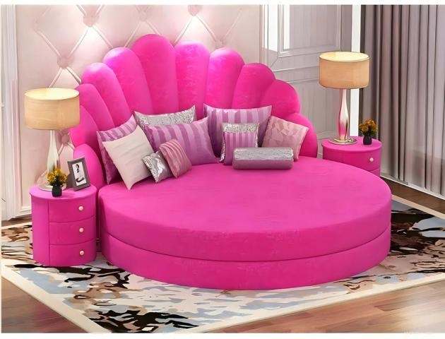 Embodying the essence of contemporary elegance, the round white bed with sumptuous purple velvet upholstery redefines luxury in the modern bedroom. Crafted with meticulous attention to detail, its soft white fabric envelops a carefully designed frame, offering both comfort and sophistication. The striking combination of the pristine exterior and the rich, opulent hue of the velvet creates a captivating focal point, seamlessly blending with an exclusive home ambiance. This bed is not merely a piece of furniture; it is a statement of refined taste, inviting you to immerse yourself in an unparalleled sleeping experience. Elevate your sanctuary with this exquisite manifestation of luxurious living, tailored for those who appreciate the finer things in life.