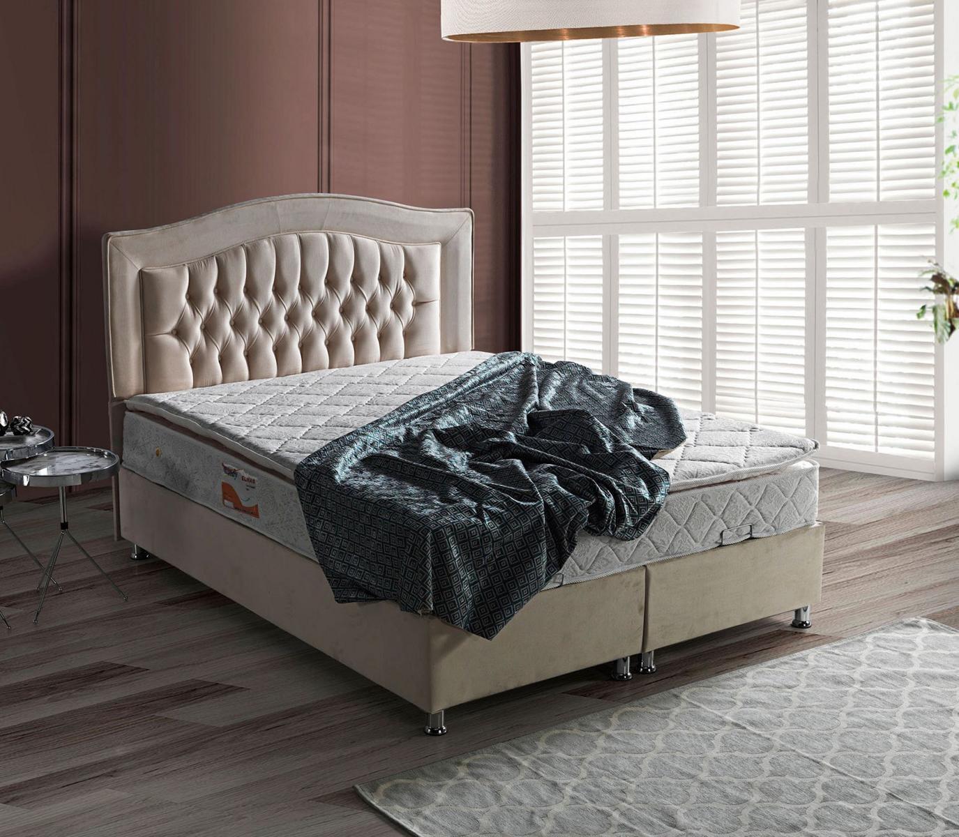 The 'Bed Design: Luxury Beds' offers a spacious lying surface of approximately 160 x 200 cm, perfect for indulging in restful nights and relaxed mornings. Its size, combined with the sturdy wood material, supports a robust yet sleek structure, ensuring both function and aesthetics are in harmony. Imagined as a centerpiece for any bedroom, this bed's refined look is versatile enough to blend with both contemporary and classic themes. Whether setting up a master suite or revamping a guest room, the beige upholstery and silver Chesterfield details bring an air of luxury and elegance that speaks of timeless taste. Experience unparalleled luxury and comfort every night with this exquisite bedroom furniture.