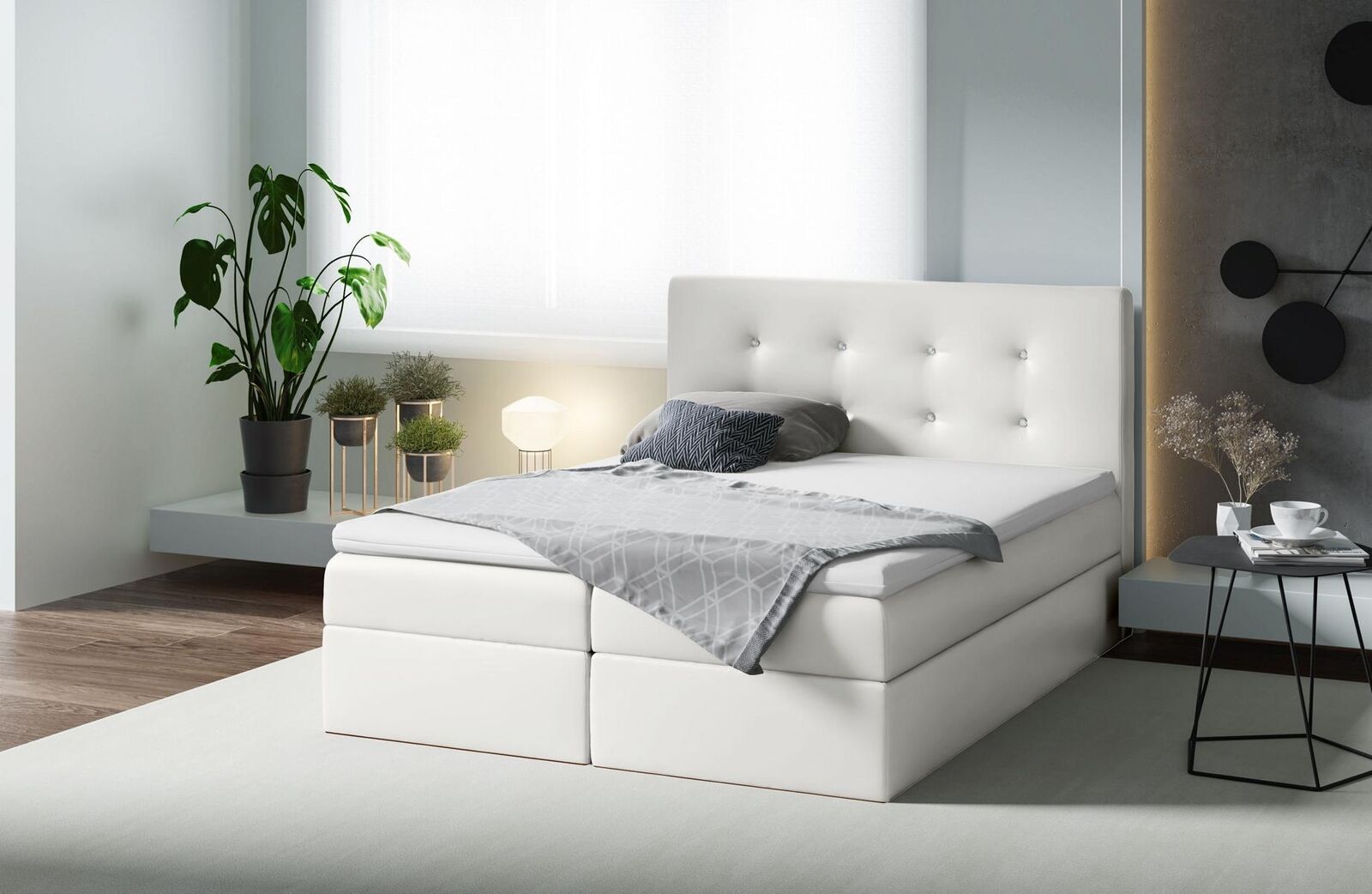 The 'Boxspring Bed Double Hotel Furniture Beds Bedroom Setup Big 200x200' is the epitome of luxury and comfort, designed to transform your bedroom into an elegant sanctuary. With a generous lying surface of approximately 200 x 200 cm, this stunning piece provides ample space for restful slumber. The main mattress is constructed with highly flexible pocket springs and T30 foam, ensuring outstanding support and adaptability to your body's contours. A top layer of highly flexible foam with a standard height of 5 cm adds an extra layer of plush comfort. The bed's sophisticated appeal is further enhanced by a quilted straight headboard embroidered with crystals, included in the price, or with optional padded buttons for a personalized touch. With two bed boxes incorporated into its base, you’ll benefit from convenient storage solutions, easily accessible thanks to the spring-loaded opening mechanism.