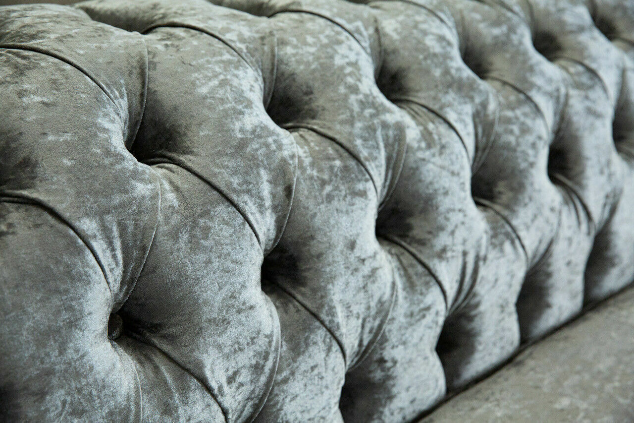 Experience the ultimate in luxury and comfort with the Chesterfield Gray Upholstered Four-Seater Designer 4-Seater Couch, a statement piece that seamlessly combines classic elegance with modern enhancement. Measuring approximately 265 cm in length, this sofa offers ample seating for family or guests, with a generous seat depth of about 64 cm providing a cozy and welcoming feel. Choose your perfect color from a wide selection, ensuring a bespoke match for your decor. Crafted with care, the couch features a premium textile material that exudes sophistication. For those seeking added luxury, the option to upgrade to premium materials such as calfskin from Italy or stain-resistant Magic Home fabric is available. The handcrafted inner frame made from real wood, paired with innerspring technology, ensures long-lasting durability and comfort.
