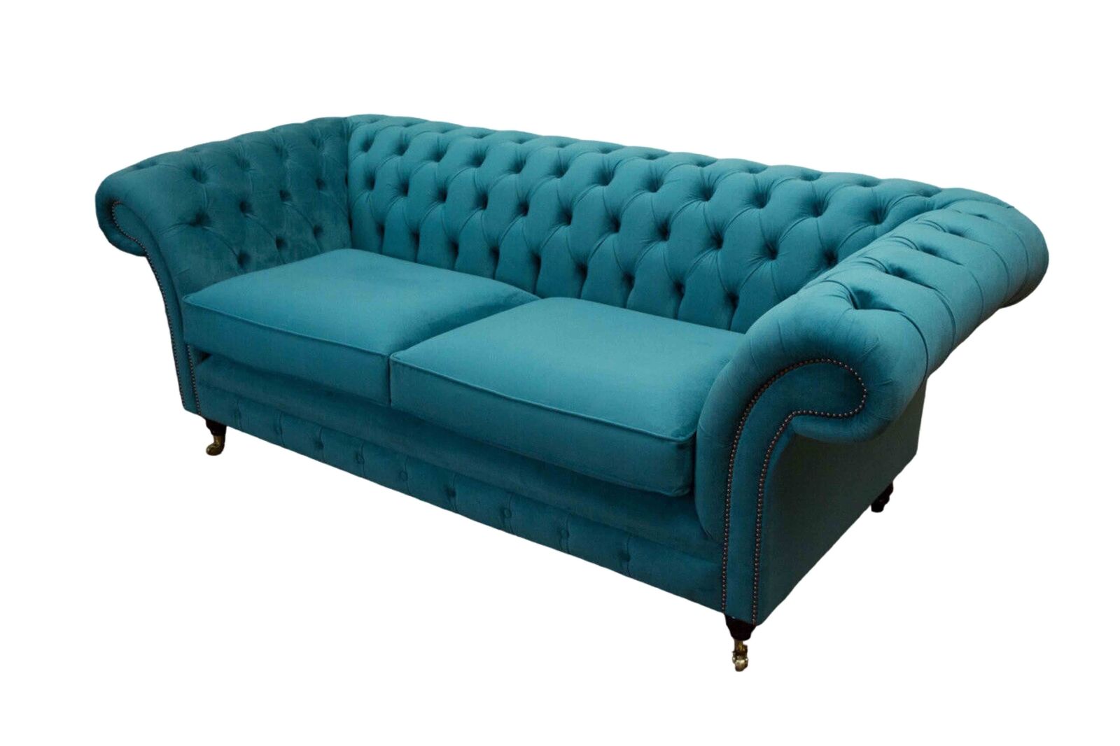 The 'Chesterfield three-seater blue fabric living room design upholstered sofa' is a masterpiece of sophisticated comfort and elegant design. Crafted with meticulous attention to detail, this sofa offers a generous dimension of approximately 230 x 80 x 90 cm, making it a perfect fit for any living room atmosphere. Its seat height of about 42 cm and seat depth of approximately 52 cm ensure optimal comfort and ergonomic support. The frame is constructed from real wood, ensuring durability and stability, and features a robust spring core for added coziness. Available in a vast array of colors, the upholstery can be tailored to your aesthetic preference. The sofa gives an option for customization in premium faux leather or fabric at no extra cost, or you can enhance its elegance with options like premium genuine Italian cowhide leather or premium velvet fabric at an additional charge.