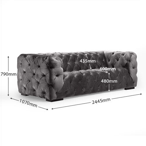 The 'Gray Chesterfield Three-Seater Couch Upholstered Style Furniture' exudes elegance and sophistication while offering luxurious comfort. With its approximate dimensions of 244.5 cm in length, 79 cm in height, and 107 cm in depth, this three-seater sofa is a perfect blend of style and functionality. Featuring an inner frame made of real wood and innerspring underfeather for enhanced support, it guarantees durability and optimum seating comfort. Available in a variety of upholstering options—from premium faux leather to genuine full-grain Italian cowhide—it allows you to customize according to your taste and decor. A free choice of color ensures that the couch seamlessly integrates into any living space, while optional additions such as crystal or Swarovski stones provide an elevated aesthetic for those seeking a touch of opulence.