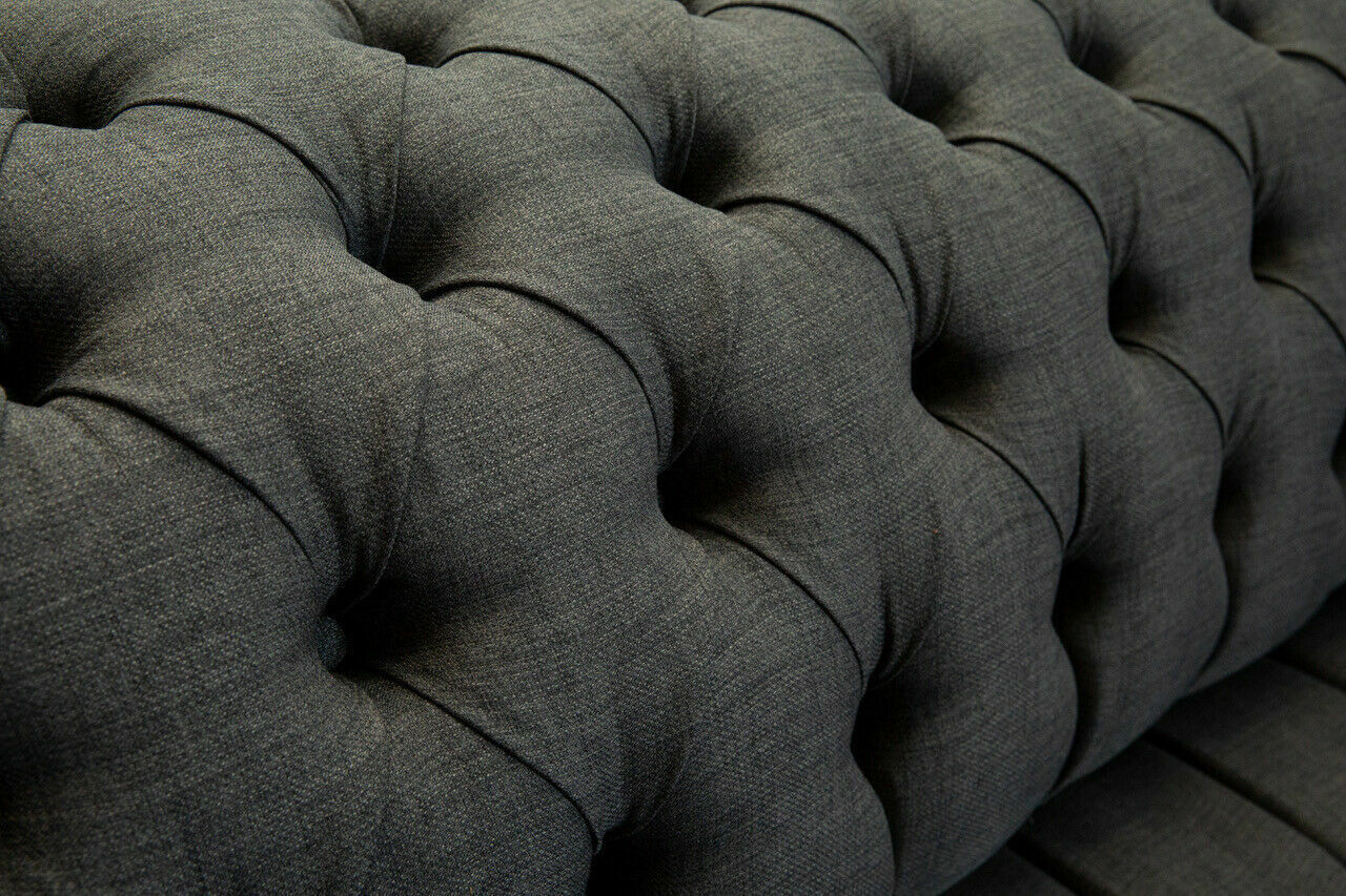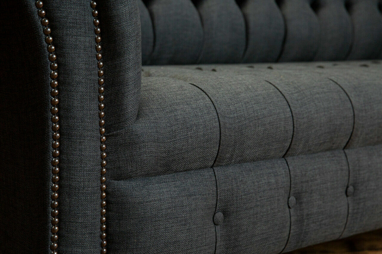 The 'Gray Textile Sofa Gray Chesterfield Three-Seater Luxury Living Room Couch' is designed to elevate your living space with its sophisticated style and comfortable seating. Measuring approximately 225 cm in length, 79 cm in height, and 98 cm in depth, this spacious **three-seater couch** offers ample room for you and your guests to relax. The seat height of approximately 42 cm and seat depth of 64 cm ensure maximum comfort, making it an excellent addition to any living room. Crafted with a **textile fabric**, this Chesterfield sofa offers a free choice of color, allowing you to customize it to match your interior décor seamlessly. With an inner frame made of real wood and supported by **innerspring cushioning**, this couch combines durability with comfort for long-lasting support and a luxurious sitting experience.