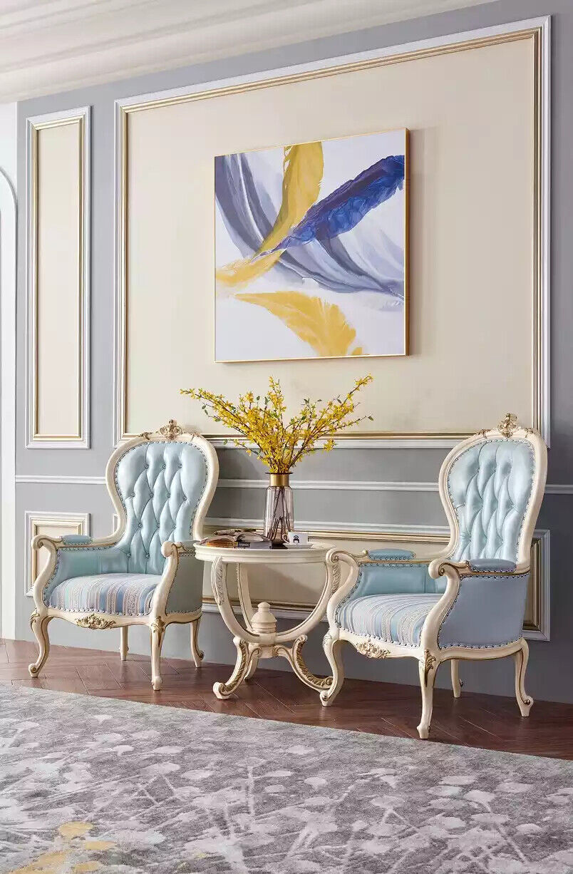 Introducing the 'Living Room Set 2x Armchairs Coffee Table 3-Piece Luxury Indoor Lounge Club Furniture', a sophisticated ensemble designed to elevate your interior spaces. This elegant set features two finely crafted armchairs and a sleek coffee table, all made from solid wood and faux leather, offering both durability and a touch of opulence. The cozy armchairs are generously sized at approximately 67 cm in length, 74 cm in width, and 120 cm in height, providing ample space for relaxation. The matching coffee table, with dimensions of approximately 61 cm in diameter and 64 cm in height, serves as a perfect centerpiece for your sophisticated living room setup, harmoniously blending glass elements with chic design.