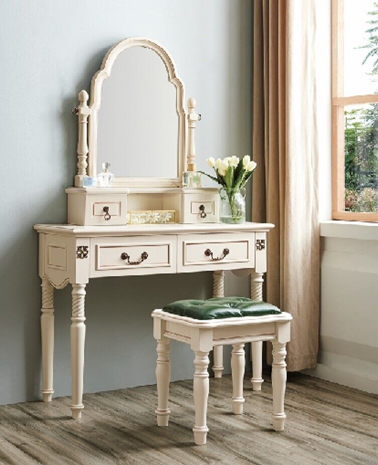 This versatile set not only functions as a makeup table but also serves as a stylish piece where you can organize your favorite accessories, jewelry, and beauty products. The dressing table's mirror is designed to provide the perfect reflection for makeup application or daily grooming tasks, making it ideal for preparing for important occasions or casual outings. Its neutral color palette seamlessly blends with various interior themes, making it a suitable choice for modern and classic settings alike. Whether you're looking to enhance a master bedroom, guest room, or personal dressing area, this **2-piece wooden set** will complement your space beautifully while providing exceptional utility. Enjoy the harmonious combination of style, practicality, and comfort with this thoughtfully designed vanity set.