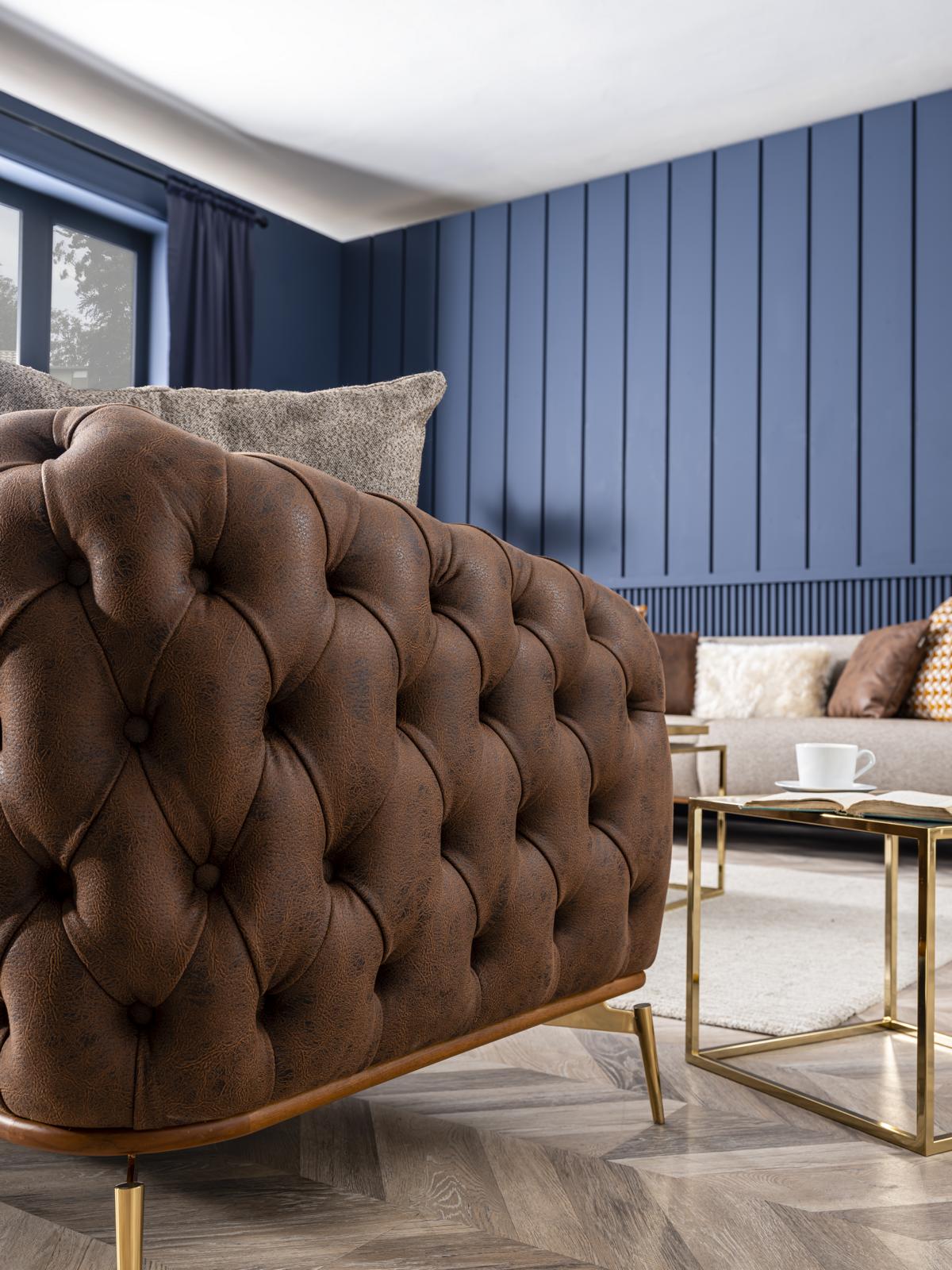 The Chesterfield four-seater sofa is a stunning piece of furniture designed to bring both comfort and elegance into your living space. Crafted with meticulous attention to detail, this sofa features a classic Chesterfield design with its signature deep button tufting and elegantly rolled arms. Measuring approximately 260 x 100 x 80 cm, it offers ample seating space for up to four people, making it a perfect centerpiece for any lounge or living room. Wrapped in high-quality, brown faux leather, this sofa not only provides the luxurious look and feel of genuine leather but also promises durability and ease of maintenance. Its polyester seating ensures a comfortable and supportive experience for hours of lounging, making it ideal for gatherings or solo relaxation sessions alike.