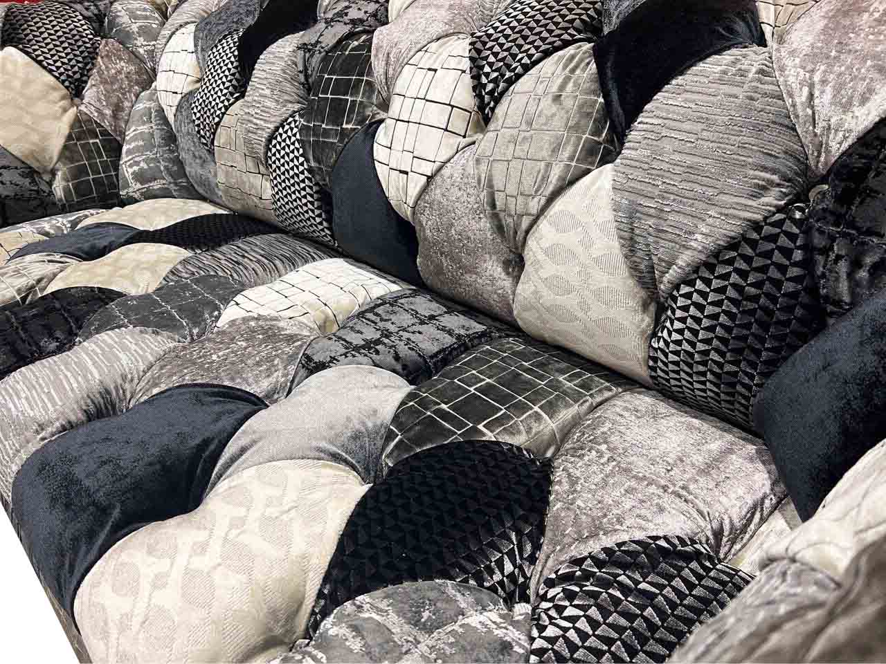 Luxurious velvet sofa in Chesterfield design with colorful checks