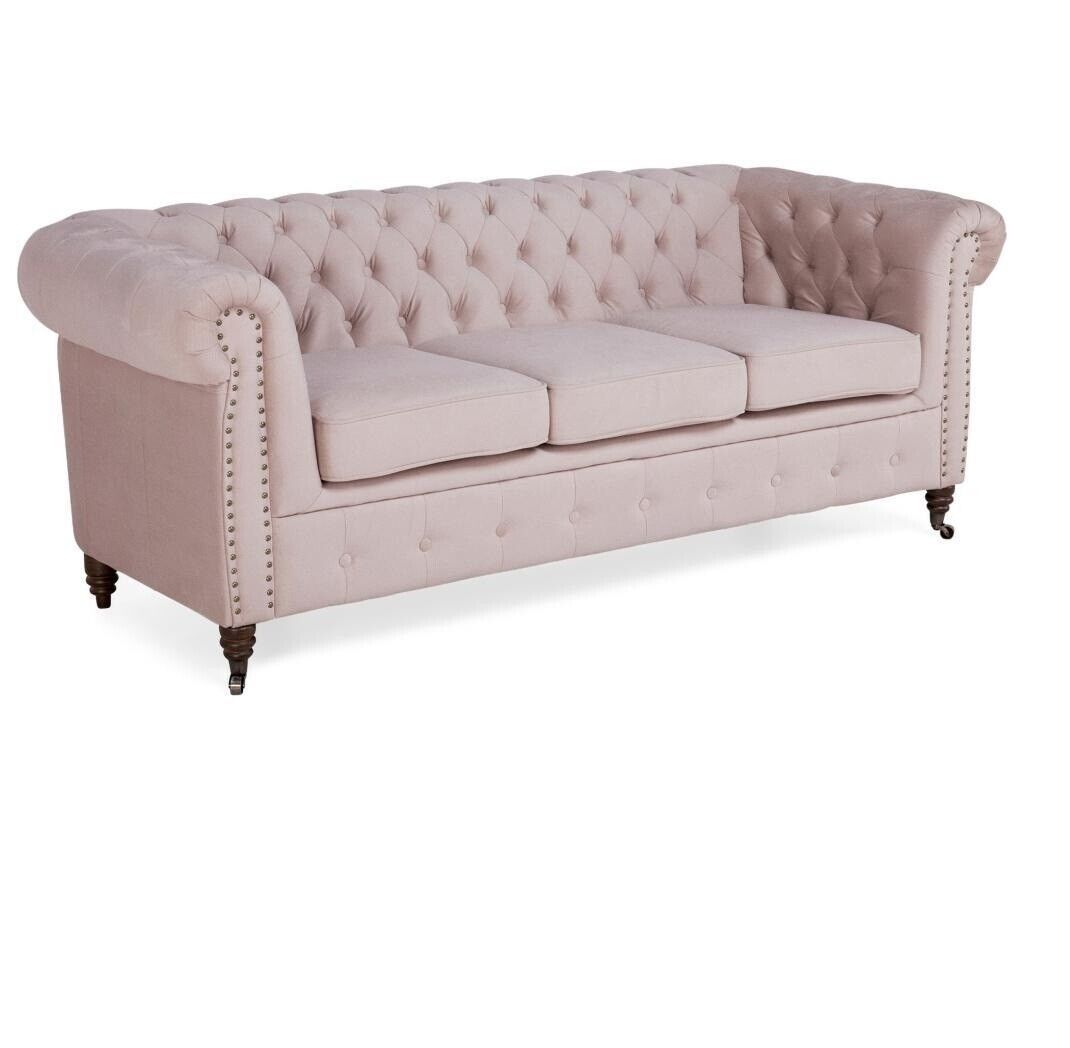 The 'Classic Chesterfield Furniture 3-Seater Couch Textile Fabric Sofa Elegant Design New' is a statement piece that combines timeless elegance with modern comfort, perfect for enhancing any living space. Measuring approximately 203 cm in length, this sofa offers ample seating with a height of 72 cm and a depth of 86 cm, ensuring both style and functionality. The seat depth of 54 cm and a seat height of 50 cm provide exceptional comfort, complemented by a robust inner frame crafted from genuine wood, supported by a durable spring core suspension for long-lasting durability. Customize your living space with a free choice of color for the upholstery in fabric or premium faux leather, offering flexibility to match your interior décor preferences.