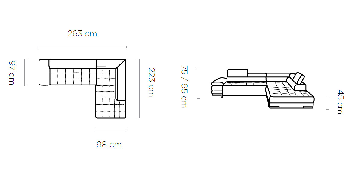 Introducing the 'Design Corner Sofa L-Shape', a perfect blend of modern elegance and luxurious comfort for your living space. With its sleek dimensions of 263 x 223 x 75/95 cm, this L-shaped sofa is designed to fit effortlessly into any corner, maximizing your room's layout without compromising on style. Its generous seat depth of approximately 60 cm and a seat height of 45 cm ensure ample room and comfort for everyone. Choose from a variety of colors and materials, including the included Fabric - Group 1 or upgrade to the **Premium faux leather** options for a touch of opulence. Built with an inner frame of real wood and featuring a **SPRING CORE** for exceptional support, this sofa promises durability and a cozy seating experience. For added functionality, a bed box is conveniently included in the price.