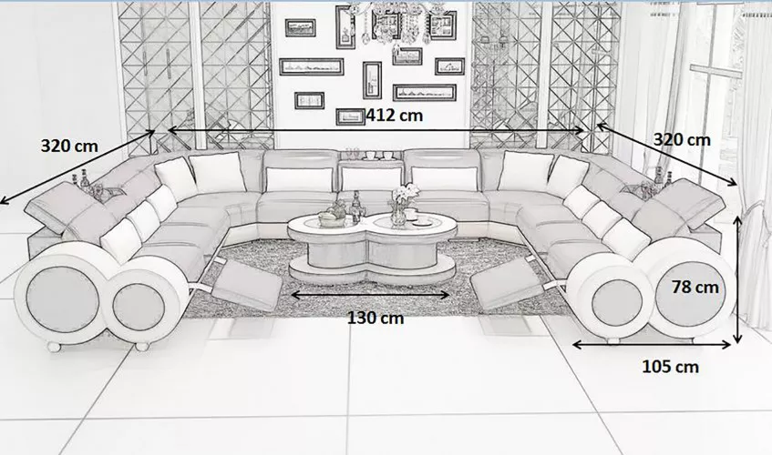 Introducing our exclusive 'Corner sofa, sofa, living landscape, design couch, sofas, upholstery, corner suite, couches, new,' a sophisticated and versatile centerpiece designed to elevate any living space. With its expansive **U-Shape design measuring a generous 320 x 412 x 320 cm**, this sofa provides ample seating for family gatherings or entertaining guests. Crafted with precision, it features a sturdy inner frame made of natural wood and a supportive inner suspension system to ensure durability and comfort. The upholstery is made from high-quality leather fiber material, combining 70% leather with 30% polyester, exuding luxury and elegance. For those with specific tastes, the sofa is available in various material groups, including **premium leather fiber, high-quality natural leather, textile fabric,** and **full-grain leather,** each designed to match different aesthetic preferences.