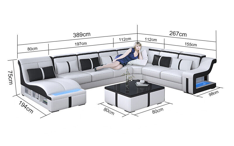 Introducing the stylish and luxurious U-shaped designer corner sofa illuminated couch, crafted to elevate your living space with its modern design and functionality. Measuring an impressive 389 x 267/194 x 75 cm, this elegant piece is made from high-quality leather that offers supreme comfort and durability. The sofa's sleek U-shape design provides ample seating space, perfect for accommodating guests or simply enjoying a relaxing evening with the family. The contemporary aesthetic is complemented by a unique LED lighting feature, which adds an ambient glow to your living environment. Its thoughtful construction ensures that both style and practicality harmonize beautifully, promising to be the centerpiece of your home décor.