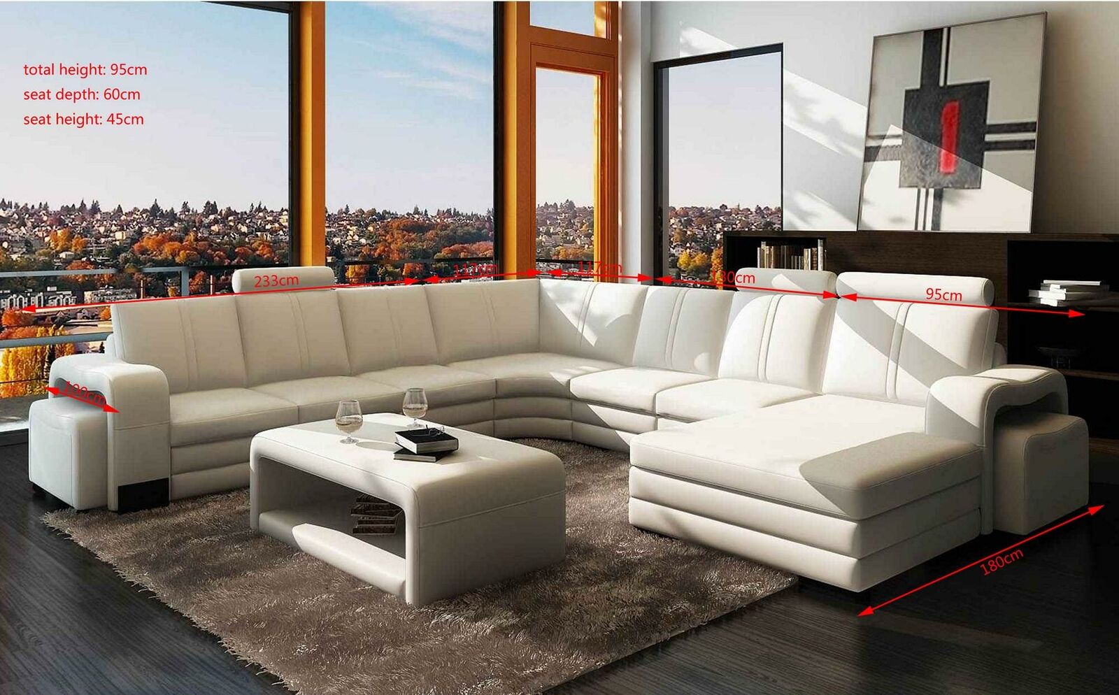 The 'Designer living landscape U-shape stool coffee table couch corner sofa upholstery' is a luxurious addition to any modern living space, bringing together comfort, style, and functionality in perfect harmony. This stunning piece boasts dimensions of approximately 180 x 342 x 350 cm, with a seat depth of 60 cm and a seat height of 45 cm, suitable for spacious living rooms looking to make a statement. Crafted with a choice of premium materials, including a **70% leather and 30% polyester leather fiber material**, it offers both elegance and durability, catering to a variety of tastes and preferences. Shoppers can opt for premium genuine leather or textile fabric for an added touch of luxury. The design incorporates an internal frame made of real wood, ensuring robustness and longevity. Complementing the sofa is a versatile stool and a chic coffee table, making this ensemble not just a seating solution but an invitation to experience comfort and class.