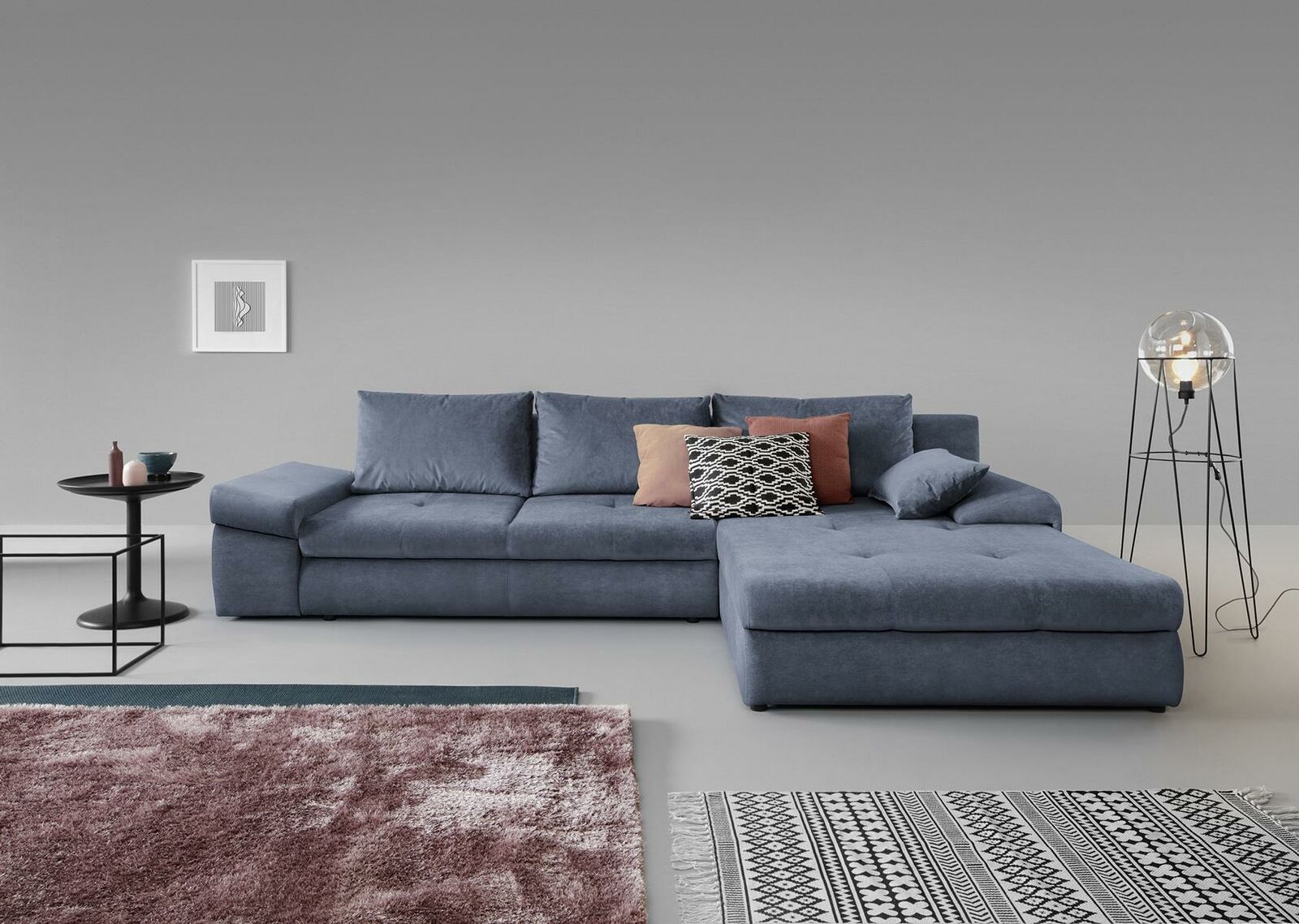 This L-shaped sofa also features a smart **sleeping area** conversion, measuring **245 x 140 cm**, making it perfect for hosting overnight guests. Its substantial **seat depth** of **60 cm** ensures cozy and inviting seating, perfect for lounging or watching TV. Whether you're looking to complement your living room's aesthetic with a subtle gray or opt for an alternative shade for a personal touch, the customizable color options allow you to make it truly yours. The sofa also offers optional material upgrades with Groups E, 1, and 2 for varied textures, ensuring a tailored experience for every homeowner. Designed for versatile living, this sofa effortlessly transforms your living space into a hub of relaxation and style.