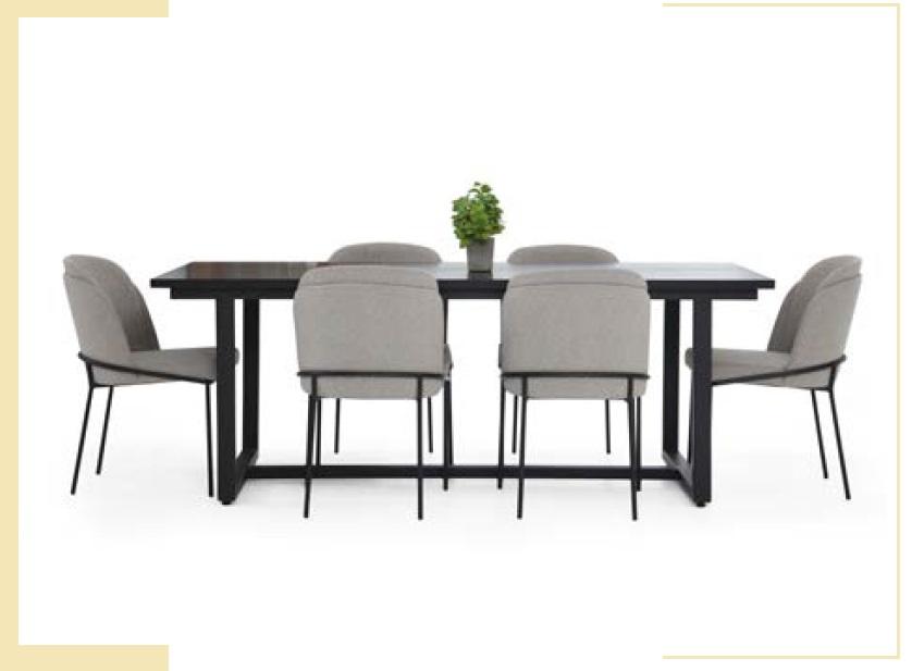 Introducing the 'Dining Area Dining Group' – a sophisticated and elegant addition to your dining space. This stunning 8-piece set is crafted with a beautiful combination of wood and fabric, exuding both modernity and timelessness. With its alluring black finish, this set seamlessly complements any interior décor. The centerpiece is a robust dining table measuring approximately 210 cm in length, 93 cm in width, and 77 cm in height, providing ample space for memorable gatherings. Complementing the table are well-crafted chairs, each with dimensions of 50 cm length, 45 cm width, and 80 cm height, offering both style and comfort to your dining experience. This set promises durability and a touch of sophistication, making every meal a luxurious affair.