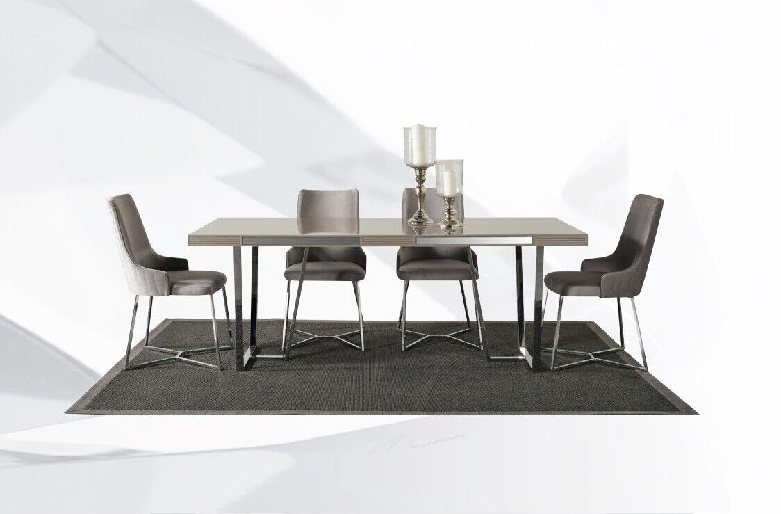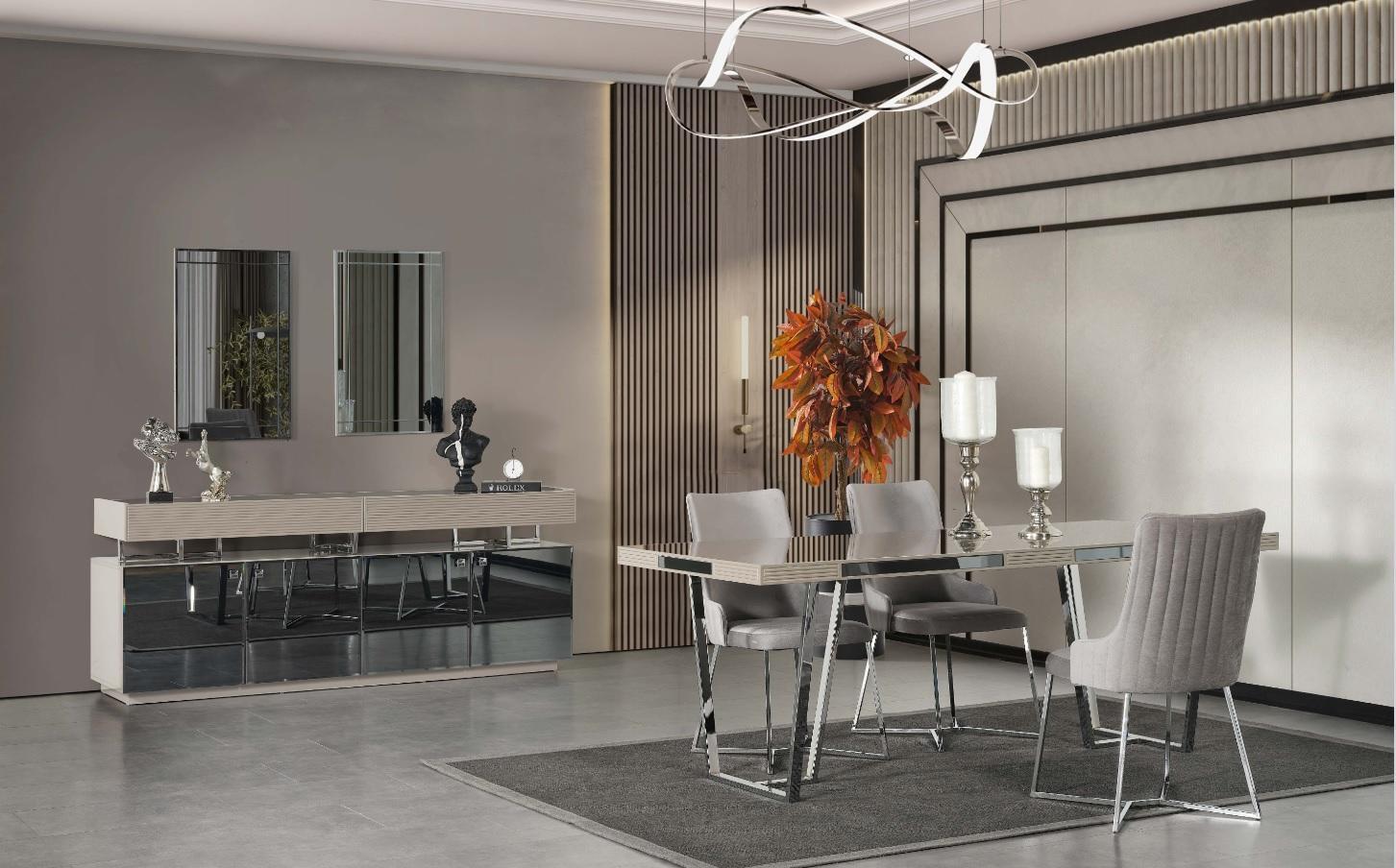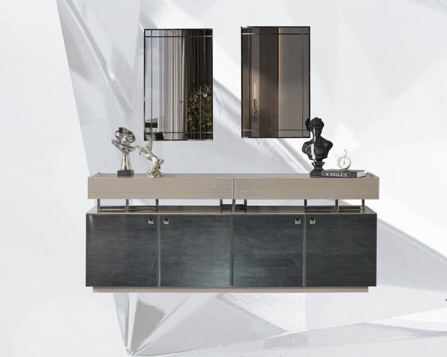 Introducing the 'Dining set dining room group dining corner dining table chairs 10-piece wood gray', a sophisticated addition to any modern dining space. This elegant ensemble features a stylish table approximately 207 cm in length, providing ample space for family gatherings or dinner parties. The set includes six ergonomically designed chairs, each measuring 52 cm by 50 cm and standing 85 cm tall, ensuring optimal comfort during extended meals. Completing this cohesive collection is a spacious sideboard with dimensions of 204 cm in length, offering practical storage solutions for all your dining essentials. Two sleek mirrors complement the set, adding an element of visual spaciousness. Crafted from high-quality wood and plush fabric, the materials exude durability and comfort, while the tasteful gray color palette seamlessly integrates with any contemporary home decor. With its blend of functionality and style, this dining set promises to elevate your dining experience.