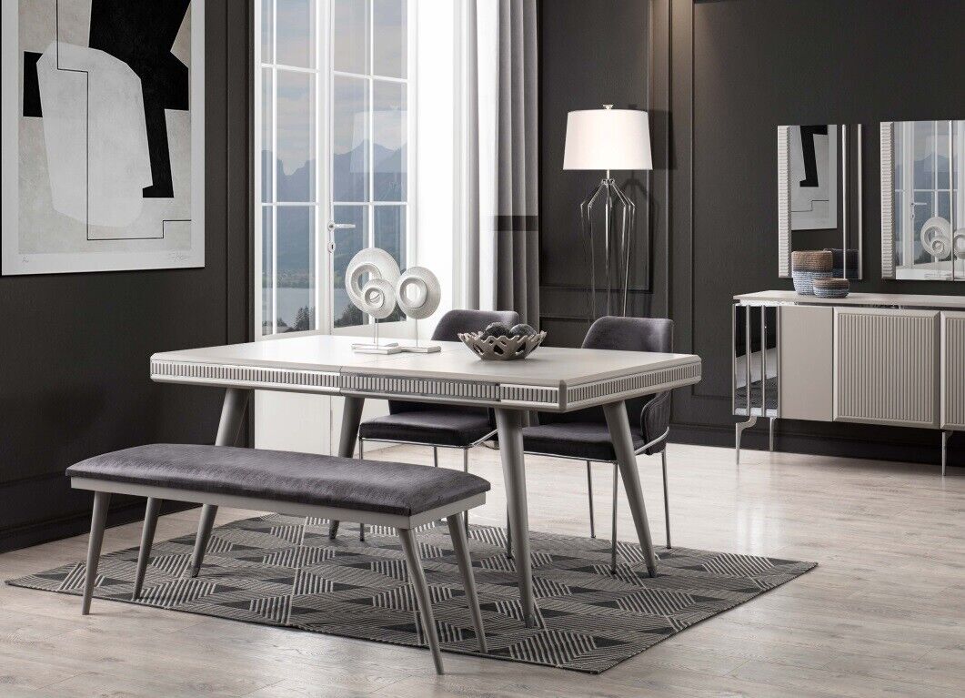 Introducing the 'Dining Set Dining Room Furniture Dining Nook Dining Table Dining Table Chairs 6-piece Gray' – a magnificent blend of style and functionality designed to transform your dining space. This elegant set includes a spacious dining table, four comfortable chairs, and a versatile bench, all thoughtfully sized to accommodate intimate family meals or entertaining guests. The dining table measures approximately 170 cm in length, 93 cm in width, and stands at a height of 77 cm, providing ample room for dining and décor. Crafted with durable wood and complemented by easy-care fabric, the rich gray hues combine contemporary aesthetics with traditional warmth, making this set a stunning centerpiece for any dining room.