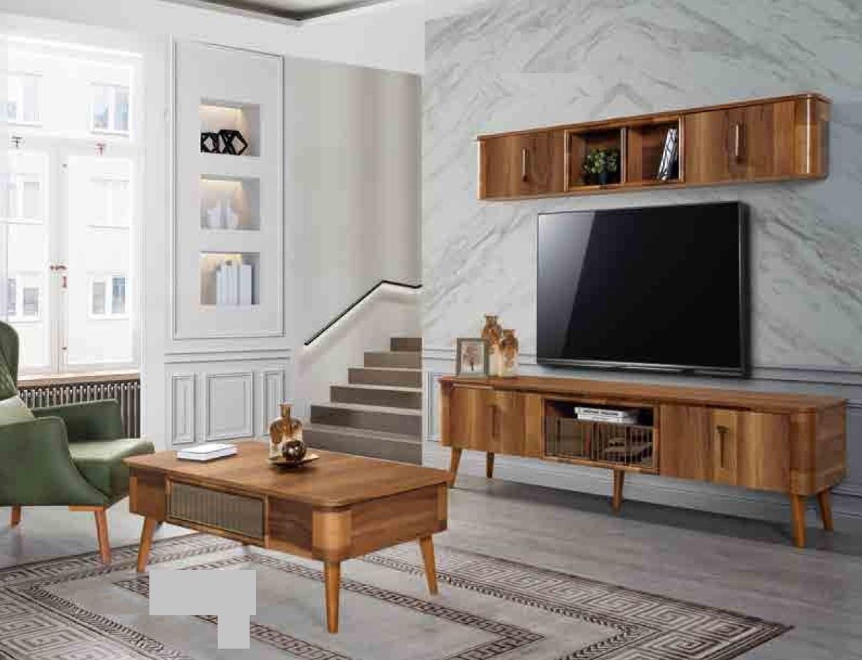 The accompanying coffee table, with a practical size of approximately 120 x 68 x 45 cm, offers a comfortable height and ample surface area for various activities, from enjoying your morning coffee to hosting evening gatherings. Its versatile design allows it to function not only as a central piece in your living room but also as an auxiliary table in larger spaces. The lack of an included wall shelf gives you the creative freedom to customize your living area with your own shelving solutions or additional décor elements, enhancing your home's aesthetic while maintaining a cohesive design theme across your furniture. This set is perfect for those looking to infuse their home with a touch of sophistication and practicality.