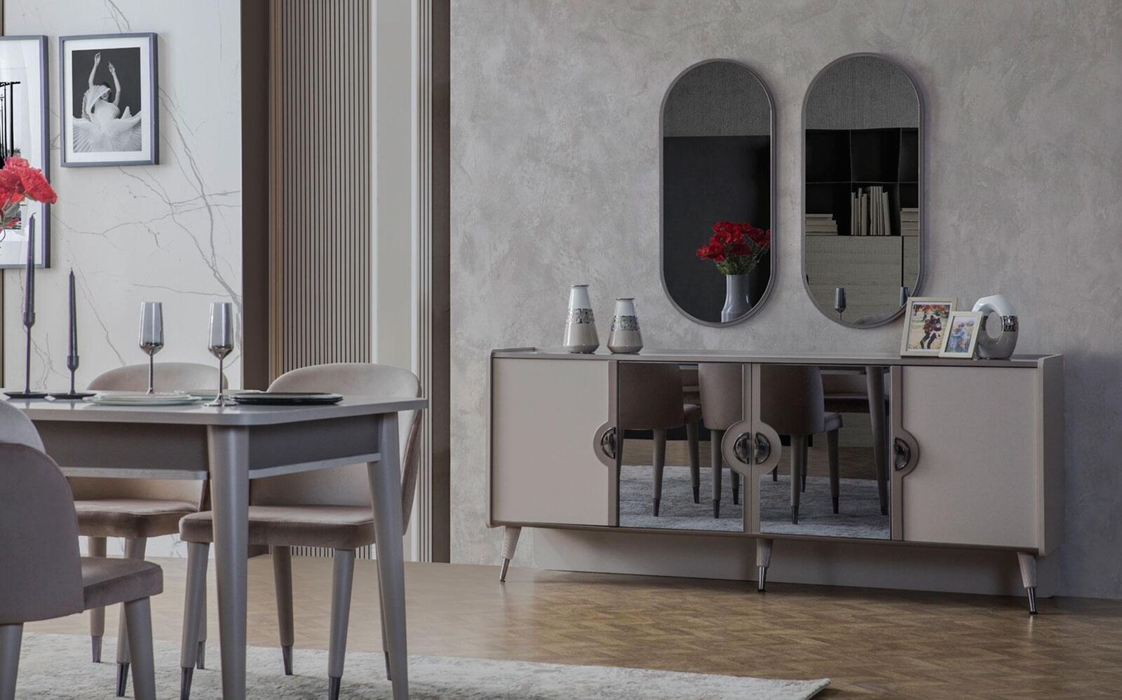 Enhancing the sideboard's sophisticated charm are the two mirrors, each approximately 44 cm in length, 3 cm in width, and 100 cm in height. These mirrors not only serve a functional purpose but also add depth and brightness to any space. The gentle gray tone of the set perfectly complements a variety of color schemes, making it a versatile choice for modern homes. Ideal for living rooms, dining areas, or even bedroom settings, this furniture set effortlessly blends beauty with utility, providing not only a stunning visual appeal but also practical storage solutions for your lifestyle needs.