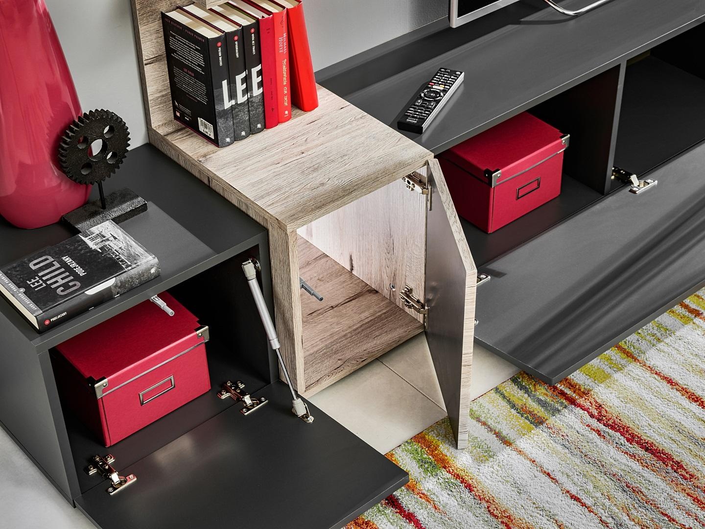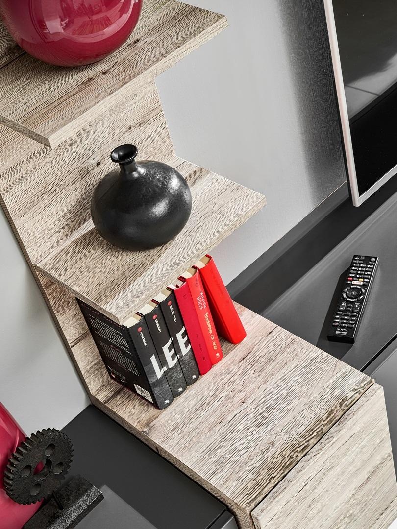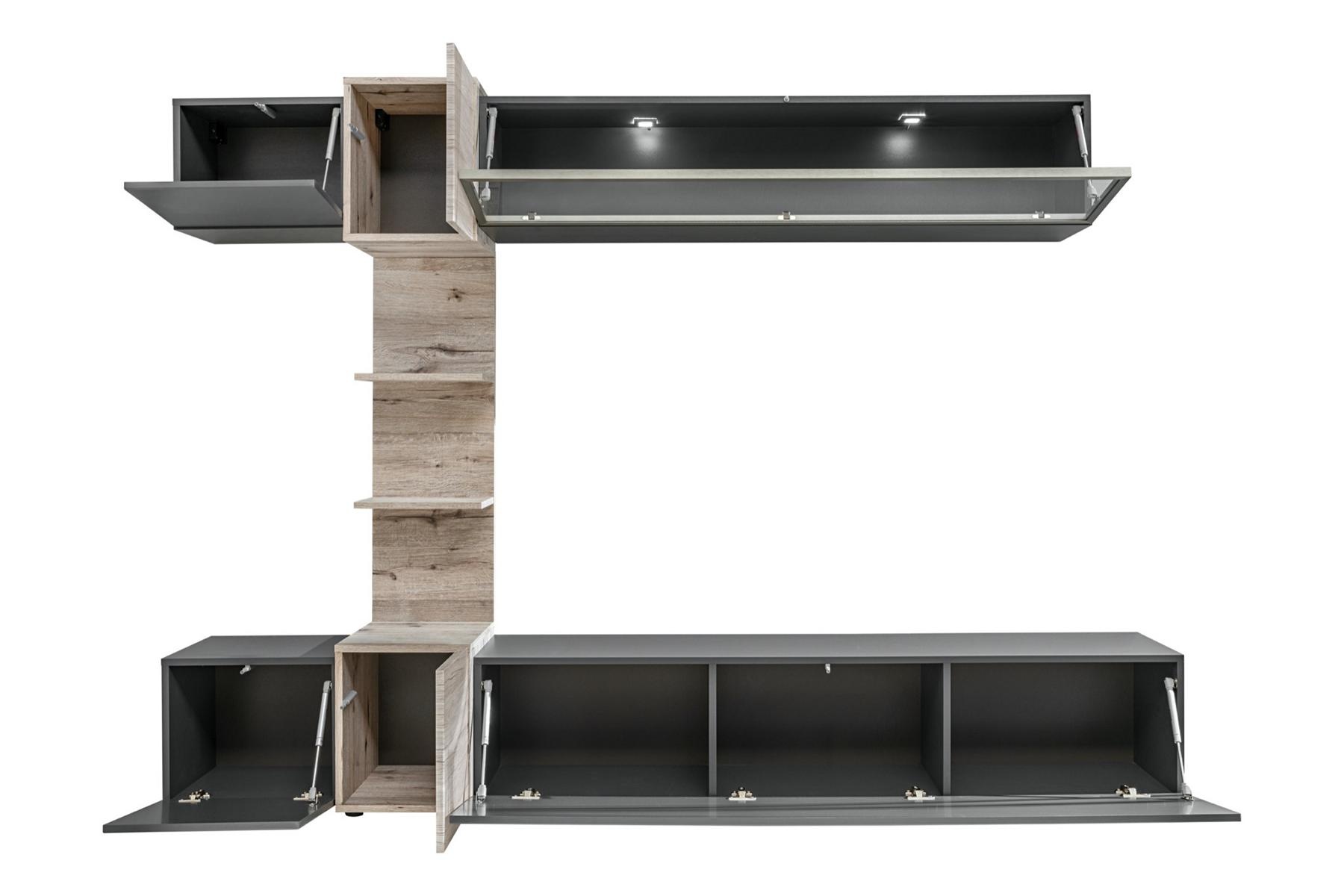 Modern wall unit for living room with gray shelves and TV stand