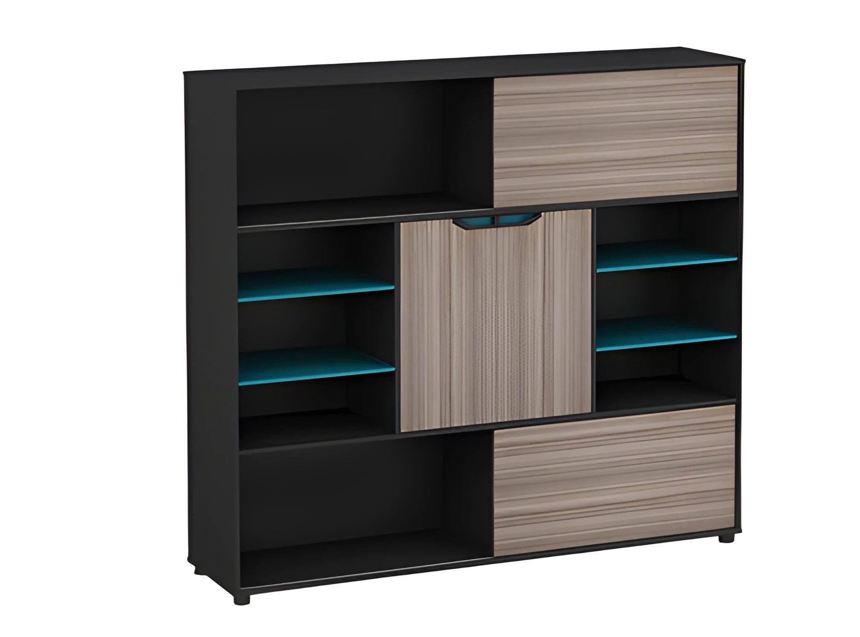 Modern cabinet, brown and black, with doors and shelves, blue, for office