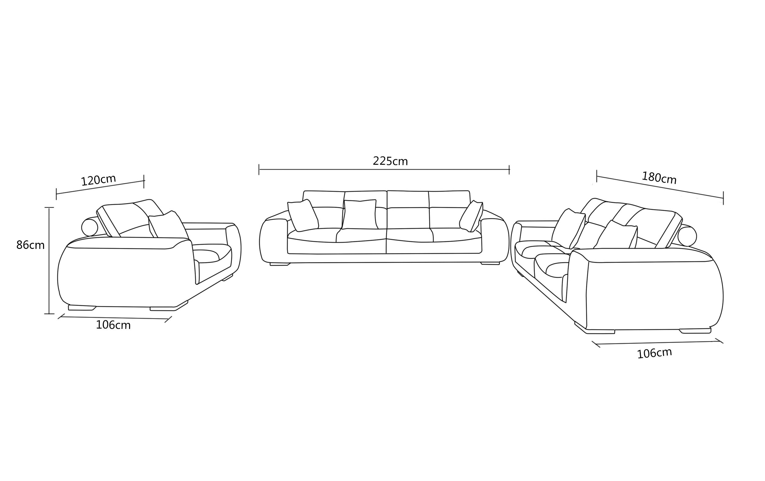 3-seater:    approx. 225 x 86 x 106 cm.