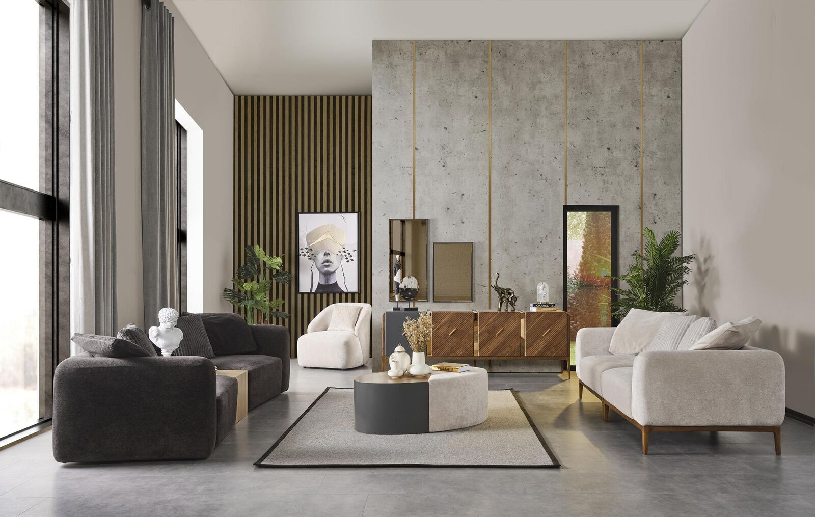 The 'Sofa Set 431-Seater Coffee Table Living Room Designer Group 4-Piece Set' is a stunning furniture ensemble that is designed to elevate the aesthetics of your living space while offering utmost comfort. This versatile set includes a 4-seater sofa, a 3-seater sofa, a 1-seater armchair, and a matching coffee table. Crafted from premium materials, the sofas boast a robust wooden frame combined with a soft yet durable textile, ensuring longevity and comfort. Measuring approximately 296 x 100 x 75 cm for the 4-seater and 230 x 100 x 75 cm for the 3-seater, these sofas provide ample seating space, making them perfect for both small gatherings and large family evenings. The set’s elegant and modern design adapts seamlessly to any décor style, offering a chic upgrade to your living area.