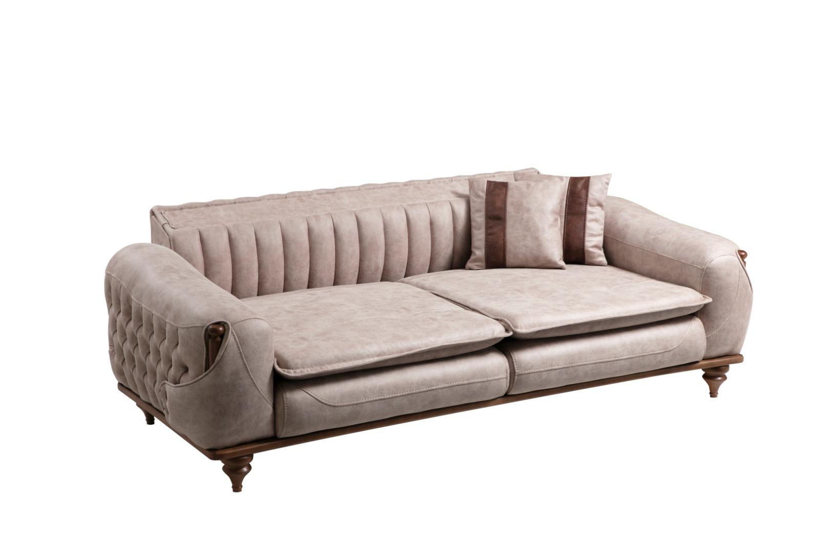 The Designer Sofa Set 3+1 brings a perfect blend of style and comfort to your living space. This elegant set features a spacious three-seater sofa, measuring approximately 240 cm in length, 90 cm in width, and 85 cm in height. Complementing it is a cozy armchair, approximately 75 cm long, 70 cm wide, and 80 cm high. Both the sofa and armchair provide ample seating space with their generous seat depths of 56 cm and 52 cm, respectively, and comfortable seat heights of 44 cm and 40 cm. The attractive textile covering complements the sturdy brown wood frame, offering a contemporary design that's sure to elevate any room's aesthetics. This sofa set also includes a stylish coffee table, enhancing the overall functionality and visual appeal.